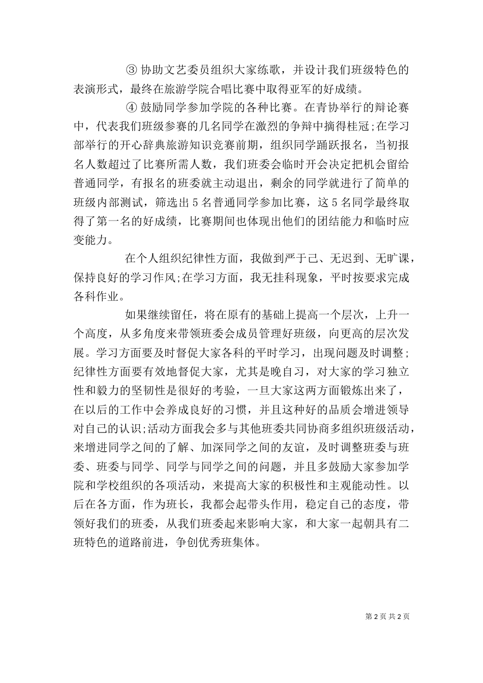 第1页共2页大学班长的述职报告同学:你们好。我是旅游二班的xxx,于20xx年11月竞选班长一职,并且竞选成功,现任期满一学期。在过去的一学...