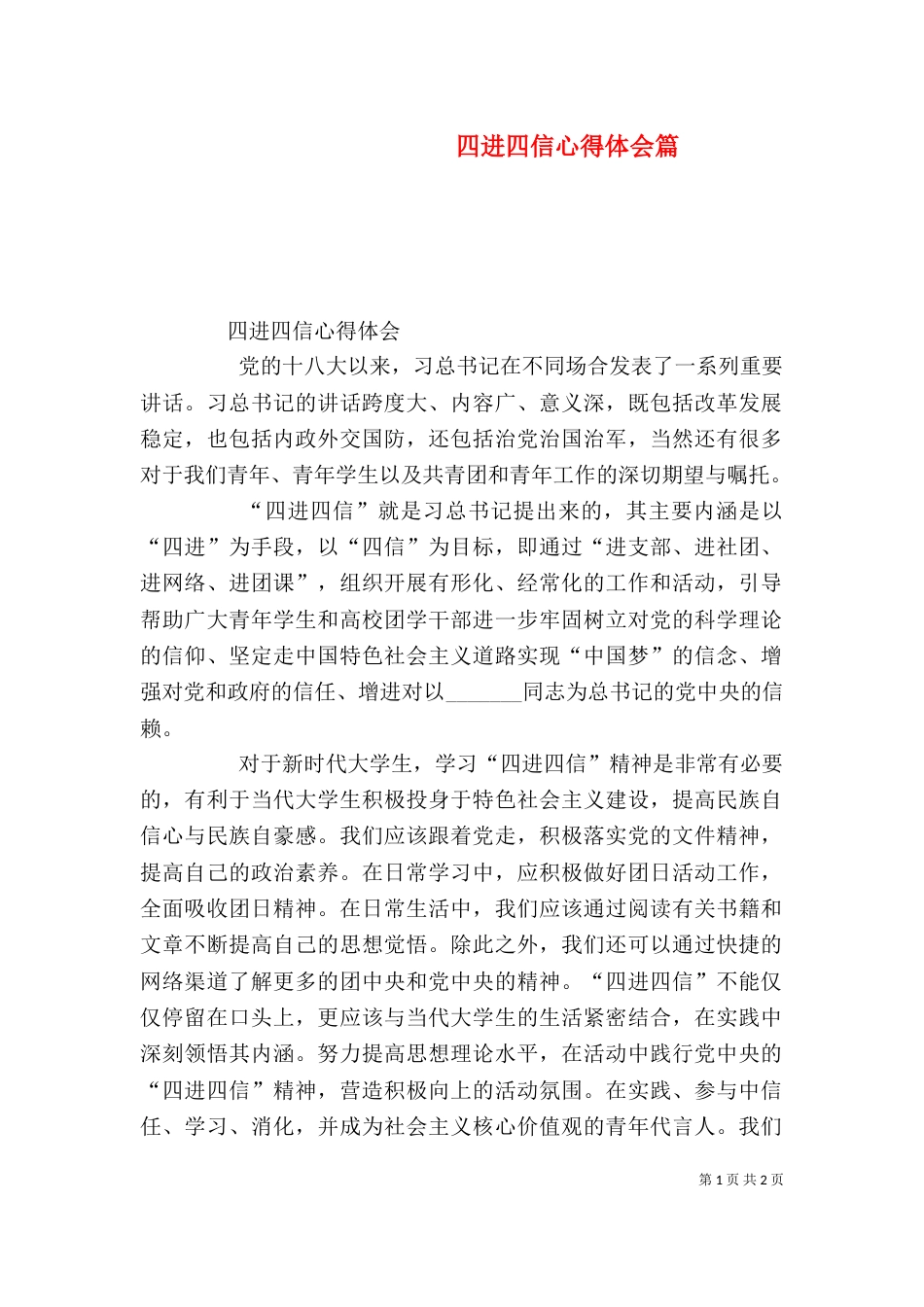 第1页共2页四进四信心得体会篇四进四信心得体会党的十八大以来,习总书记在不同场合发表了一系列重要讲话。习总书记的讲话跨度大、内容广、...