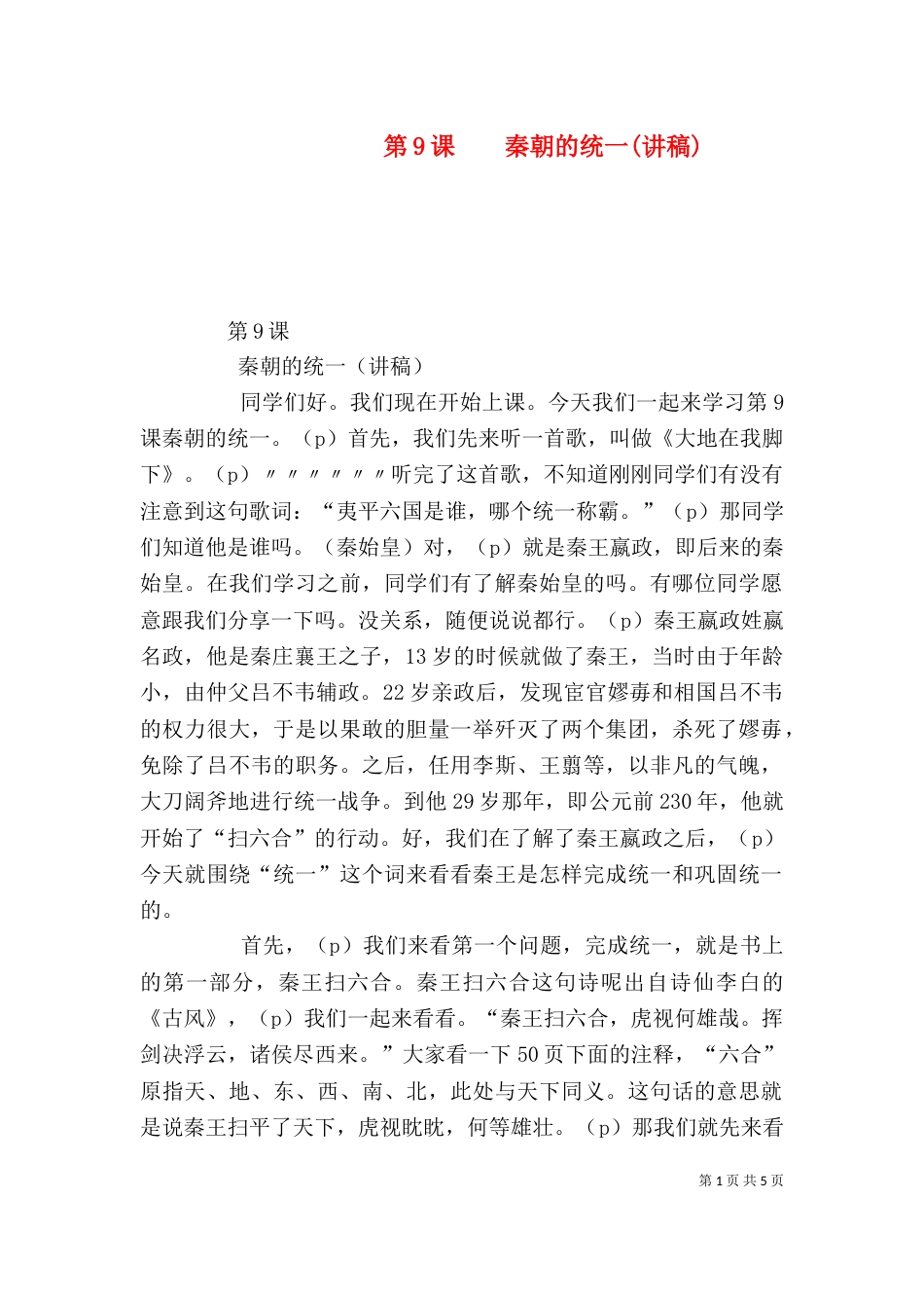 第1页共5页第9课秦朝的统一(讲稿)第9课秦朝的统一(讲稿)同学们好。我们现在开始上课。今天我们一起来学习第9课秦朝的统一。(p)首先,我...