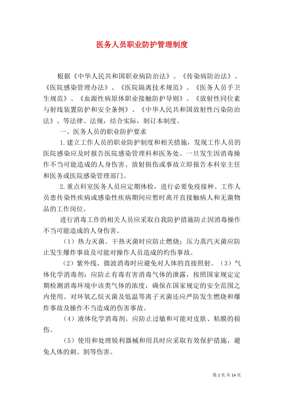 第1页共14页书山有路勤为径,学海无涯苦作舟。医务人员职业防护管理制度根据《中华人民共和国职业病防治法》、《传染病防治法》、《医院感...