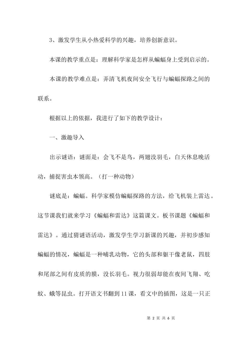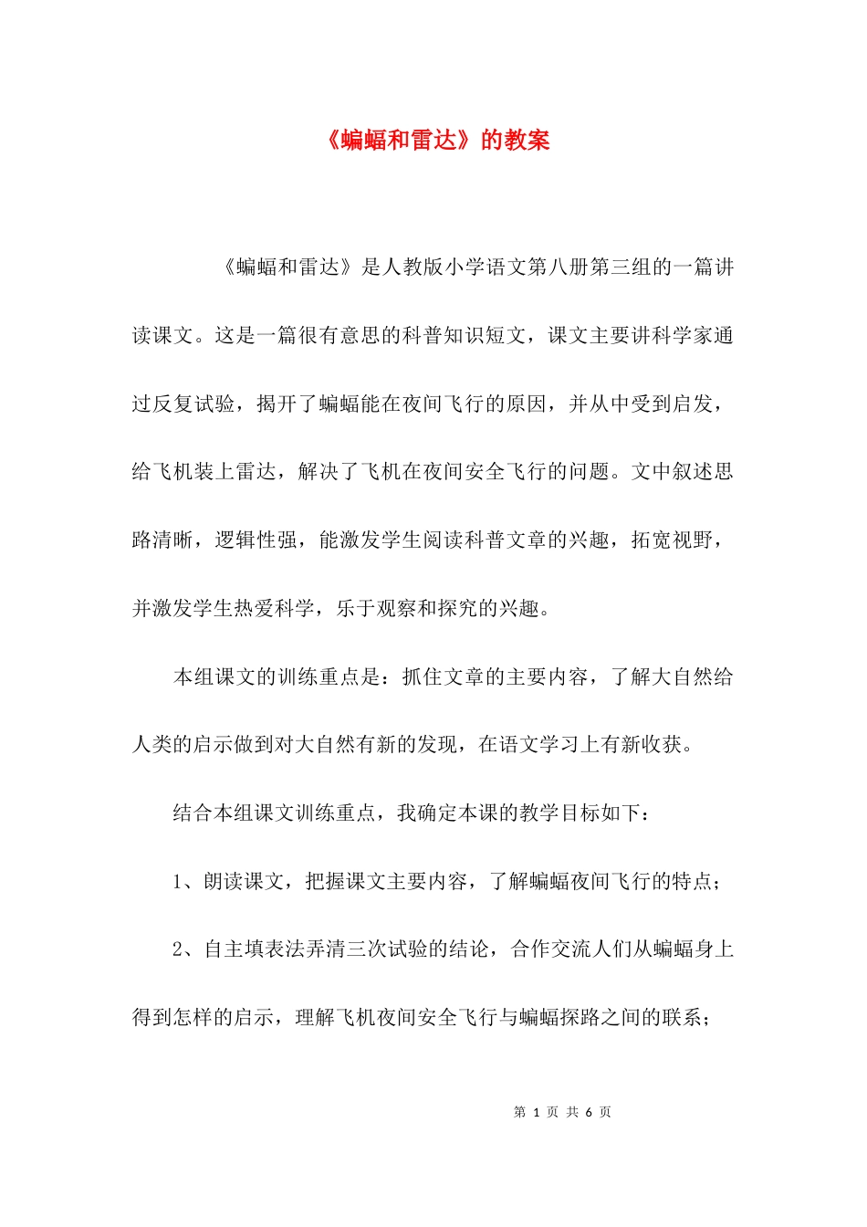 第1页共6页《蝙蝠和雷达》的教案《蝙蝠和雷达》是人教版小学语文第八册第三组的一篇讲读课文。这是一篇很有意思的科普知识短文,课文主要讲...