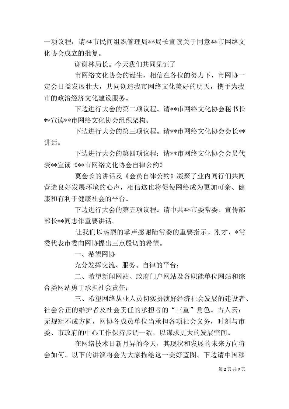 第1页共9页志愿者协会成立仪式主持词市网络文化协会成立仪式主持词(精选多篇)尊敬的*常委、各位来宾、各位从事网络文化事业的同行们:大...