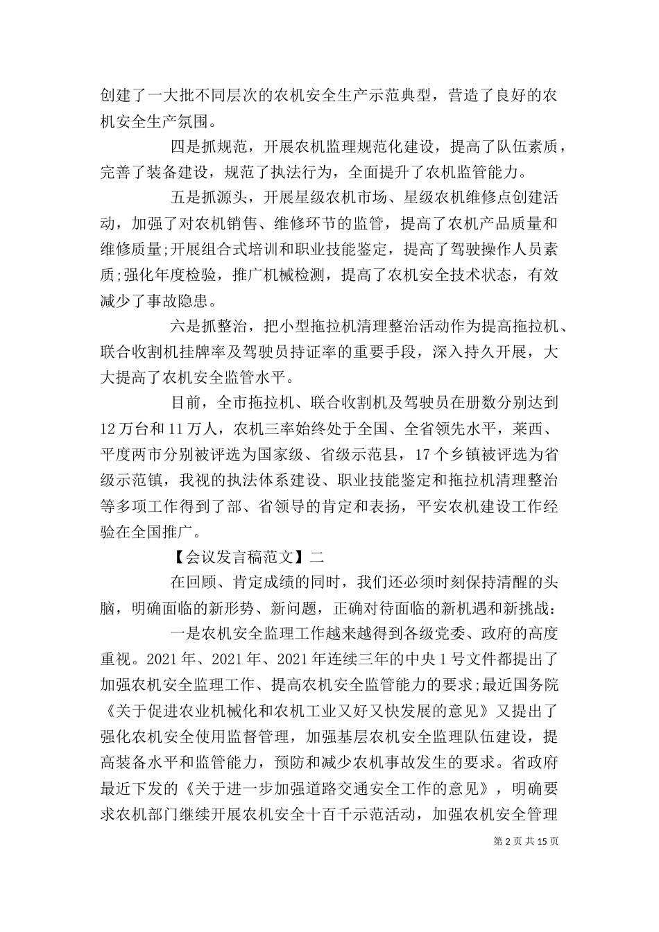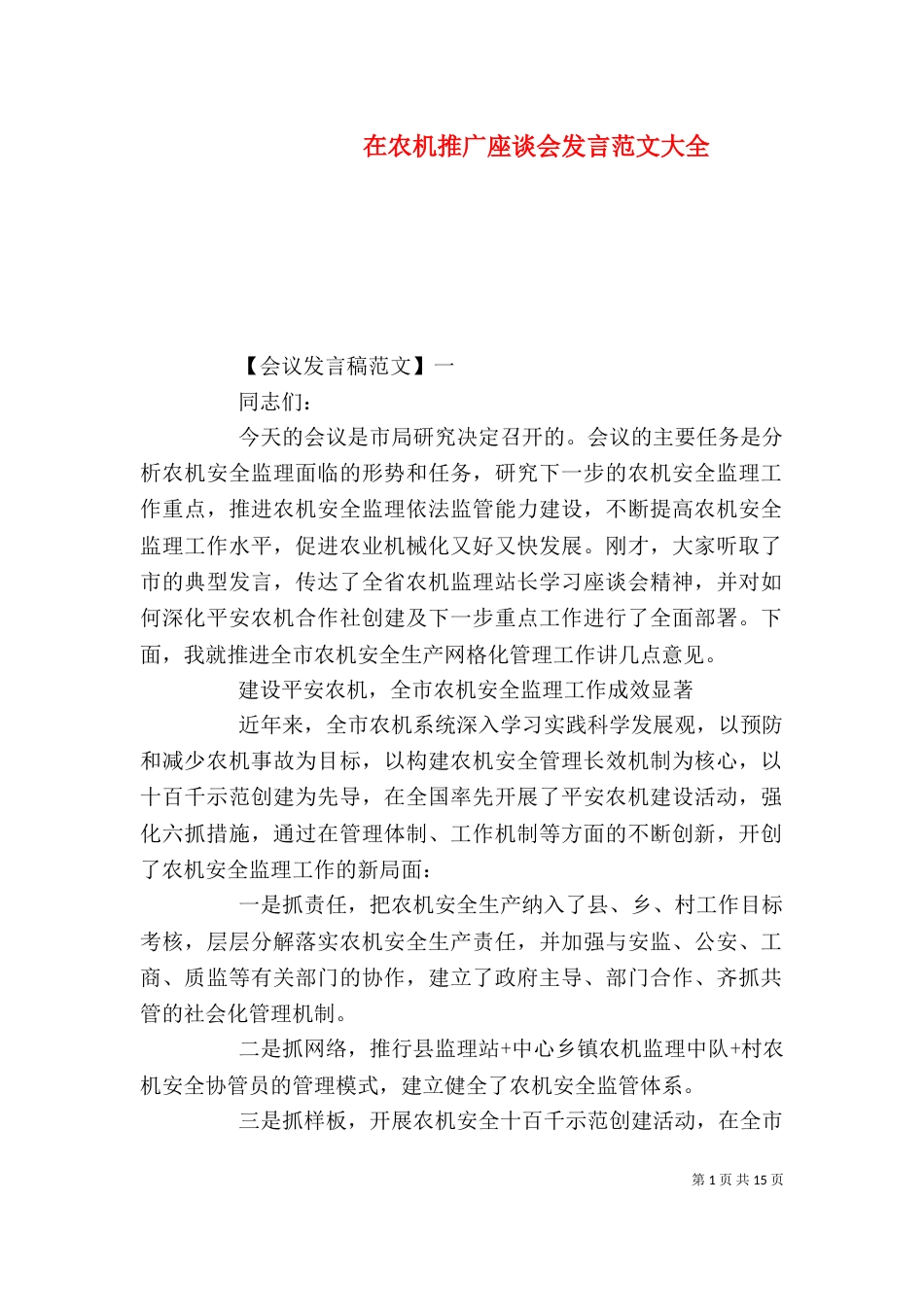 第1页共15页在农机推广座谈会发言范文大全【会议发言稿范文】一同志们:今天的会议是市局研究决定召开的。会议的主要任务是分析农机安全监...