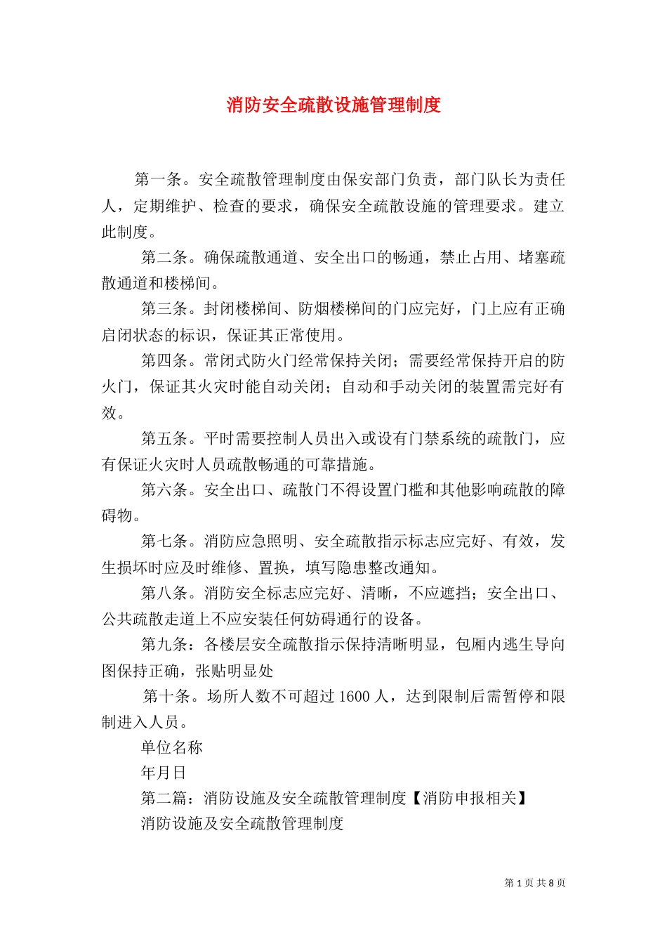 第1页共8页书山有路勤为径,学海无涯苦作舟。消防安全疏散设施管理制度第一条。安全疏散管理制度由保安部门负责,部门队长为责任人,定期维...