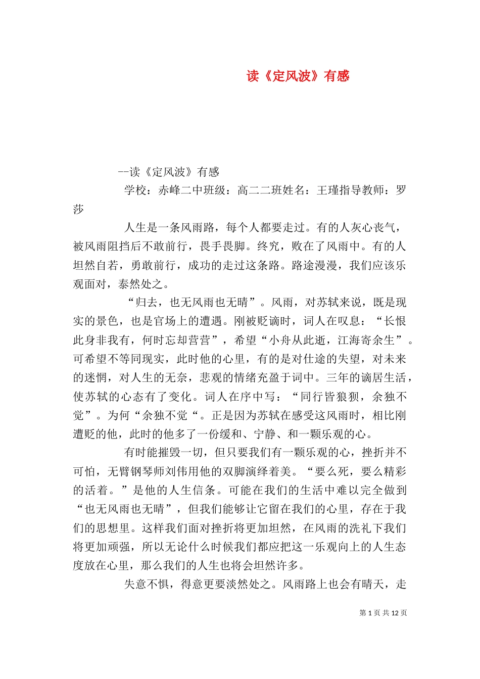 第1页共12页读《定风波》有感--读《定风波》有感学校:赤峰二中班级:高二二班姓名:王瑾指导教师:罗莎人生是一条风雨路,每个人都要走过...