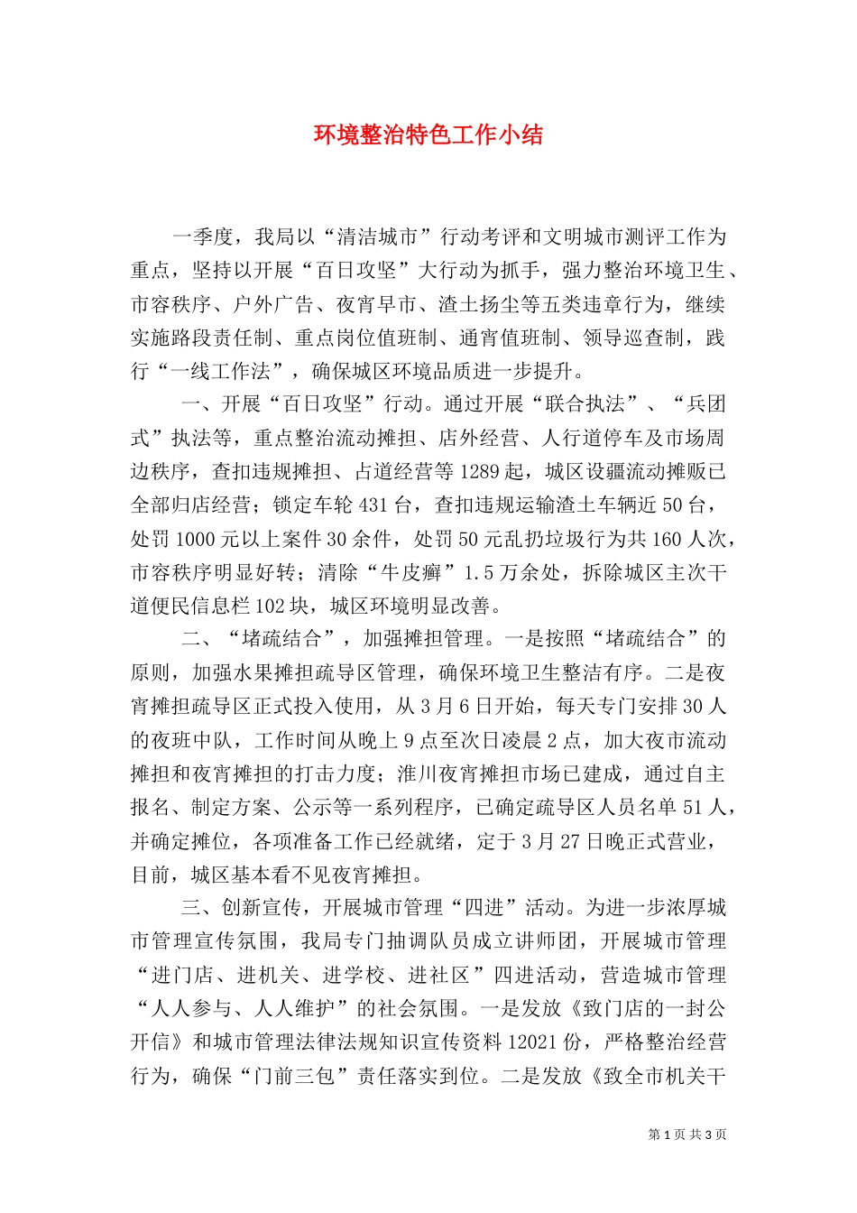 第1页共3页环境整治特色工作小结一季度,我局以“清洁城市”行动考评和文明城市测评工作为重点,坚持以开展“百日攻坚”大行动为抓手,强力...