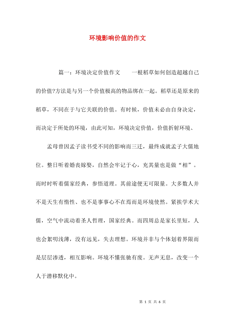 第1页共6页环境影响价值的作文篇一:环境决定价值作文一根稻草如何创造超越自己的价值?方法是与另一个价值极高的物品绑在一起。稻草还是原...