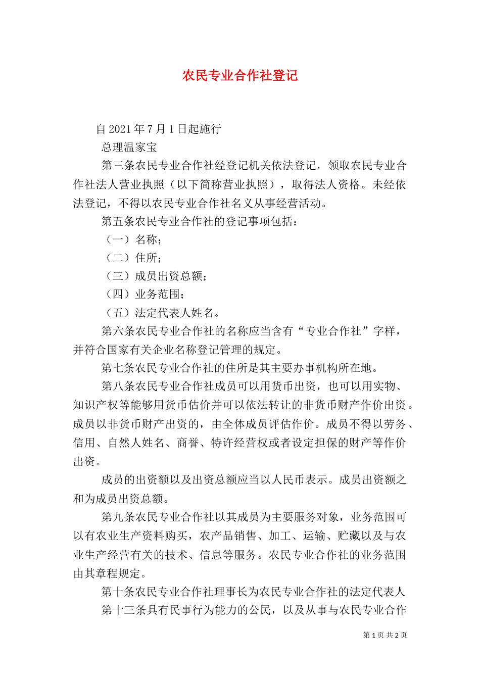 第1页共2页书山有路勤为径,学海无涯苦作舟。农民专业合作社登记自2021年7月1日起施行总理温家宝第三条农民专业合作社经登记机关依法登记,...