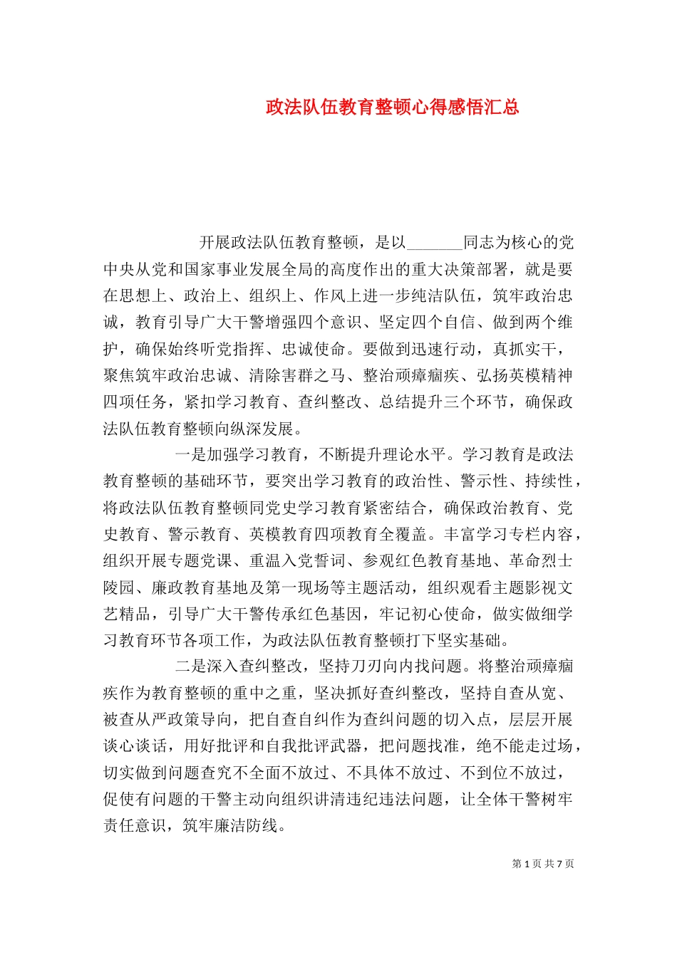 第1页共7页政法队伍教育整顿心得感悟汇总开展政法队伍教育整顿,是以_______同志为核心的党中央从党和国家事业发展全局的高度作出的重大决...