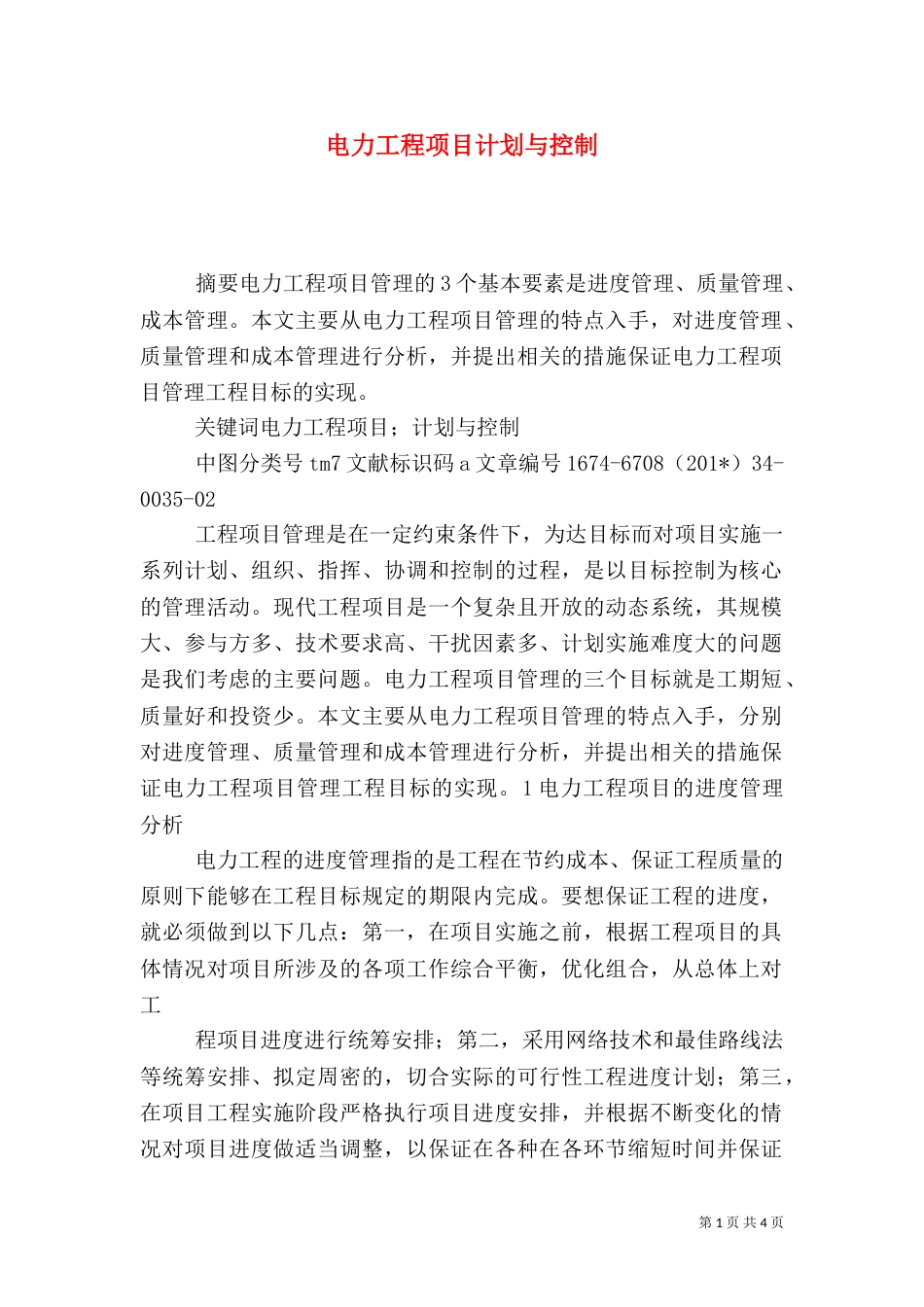 第1页共4页书山有路勤为径,学海无涯苦作舟。电力工程项目计划与控制摘要电力工程项目管理的3个基本要素是进度管理、质量管理、成本管理。...