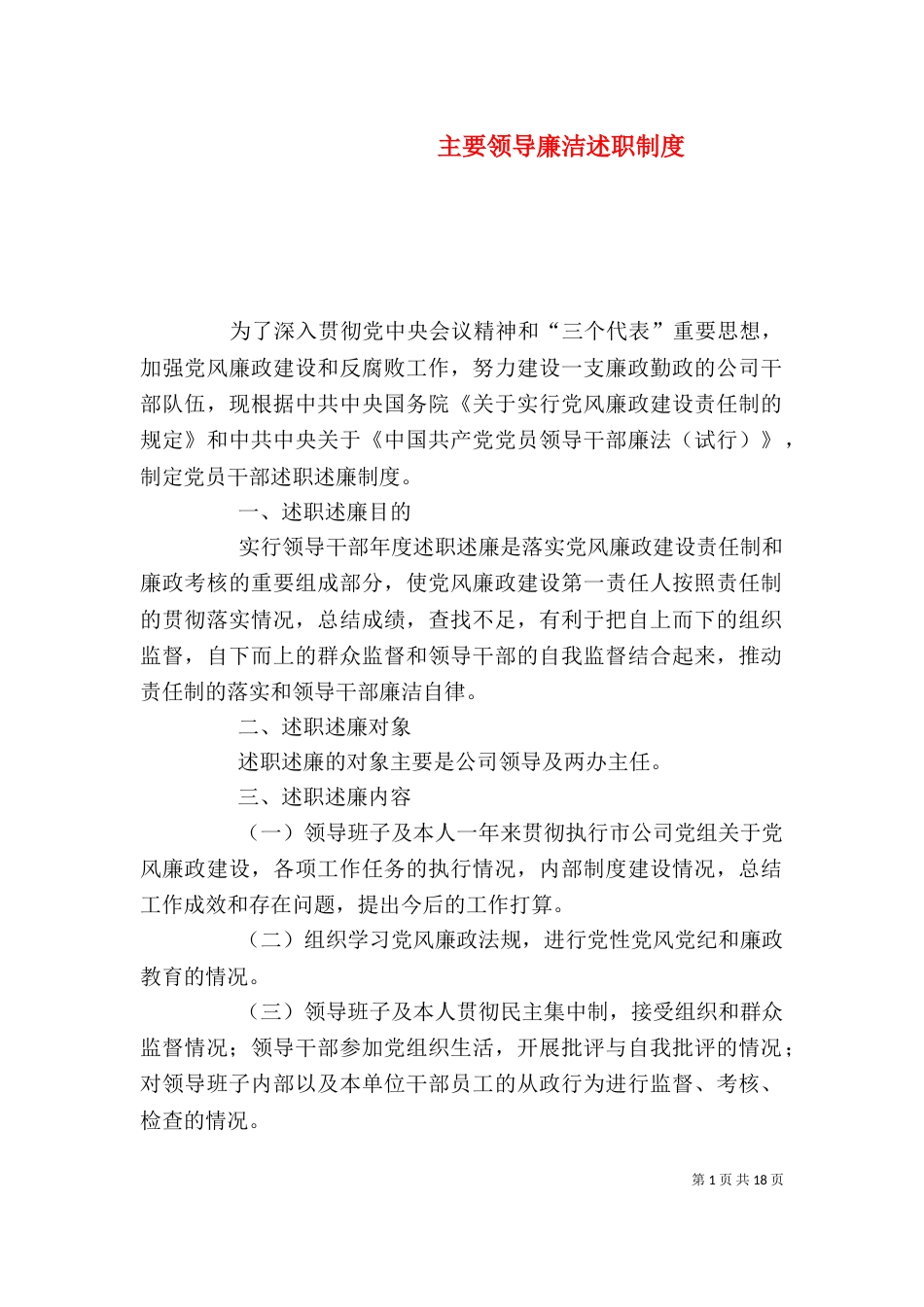第1页共18页主要领导廉洁述职制度为了深入贯彻党中央会议精神和“三个代表”重要思想,加强党风廉政建设和反腐败工作,努力建设一支廉政勤...