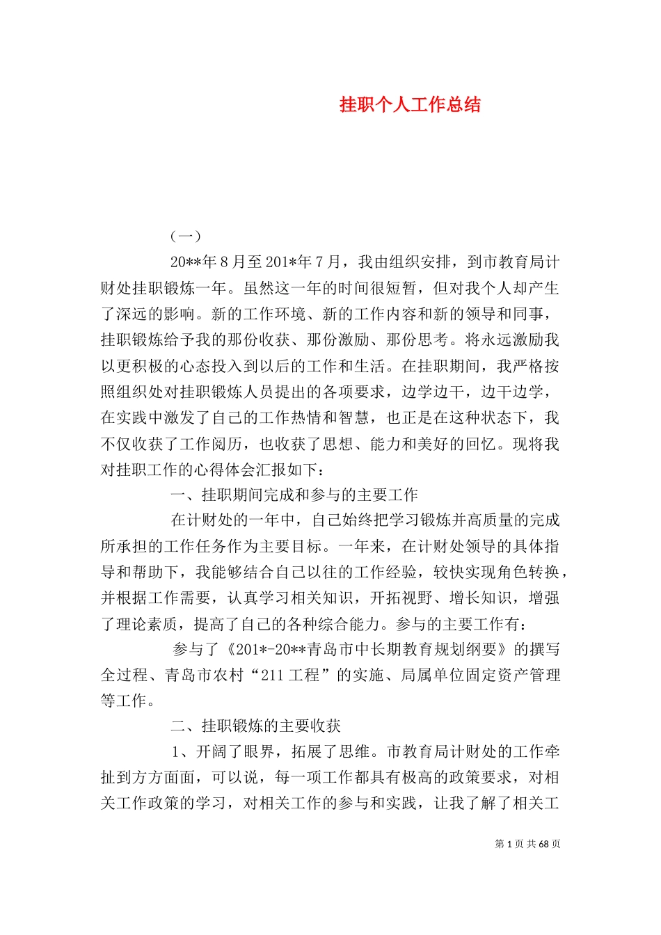 第1页共68页挂职个人工作总结(一)20**年8月至201*年7月,我由组织安排,到市教育局计财处挂职锻炼一年。虽然这一年的时间很短暂,但对我...