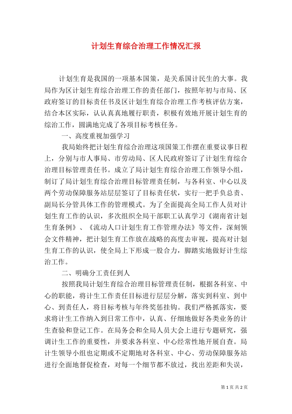 第1页共2页书山有路勤为径,学海无涯苦作舟。计划生育综合治理工作情况汇报计划生育是我国的一项基本国策,是关系国计民生的大事。我局作为...