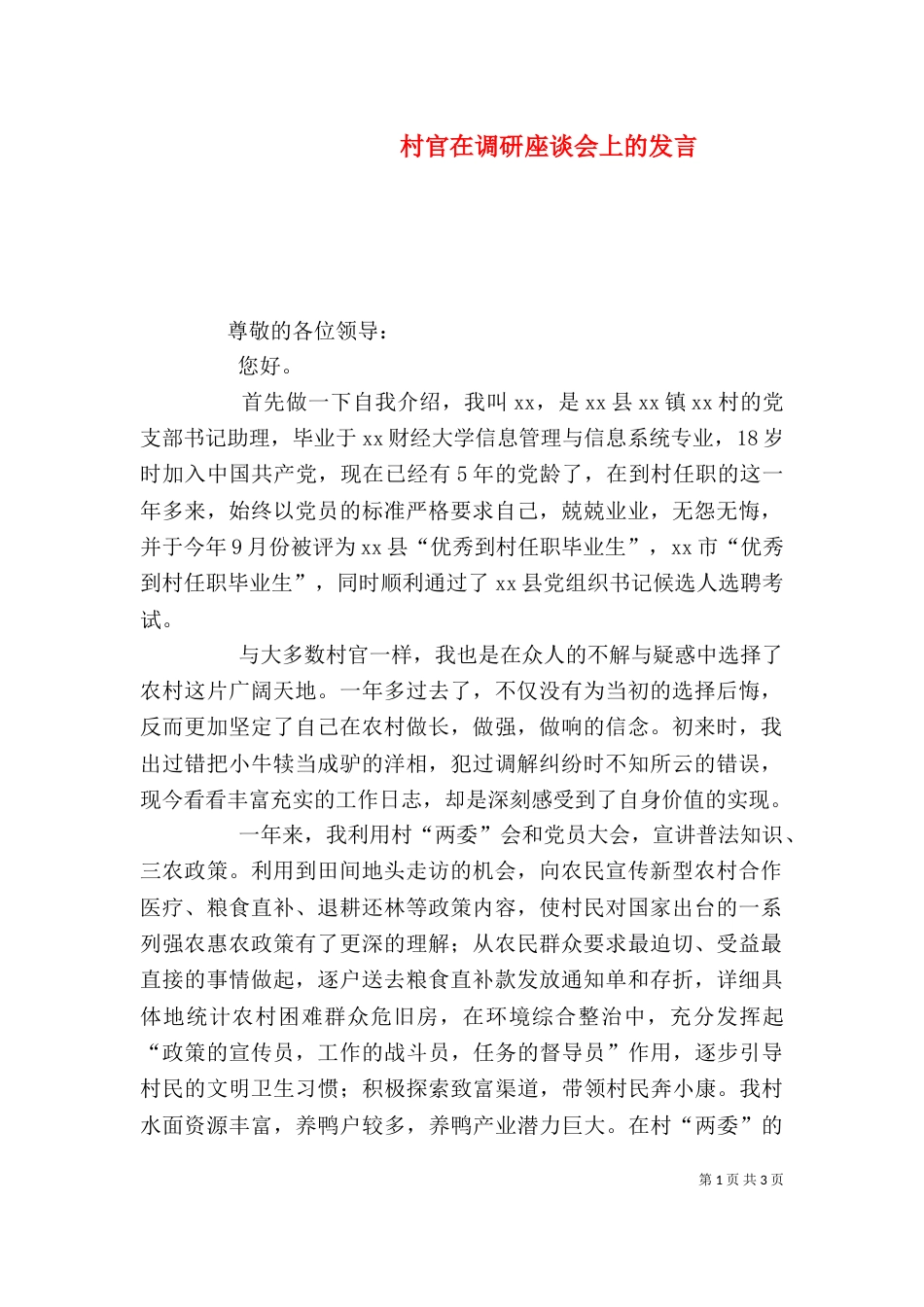第1页共3页村官在调研座谈会上的发言尊敬的各位领导:您好。首先做一下自我介绍,我叫xx,是xx县xx镇xx村的党支部书记助理,毕业于xx财经大...
