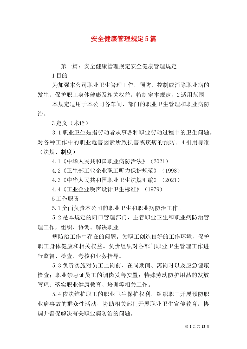 第1页共13页书山有路勤为径,学海无涯苦作舟。安全健康管理规定5篇第一篇:安全健康管理规定安全健康管理规定1目的为加强本公司职业卫生管...