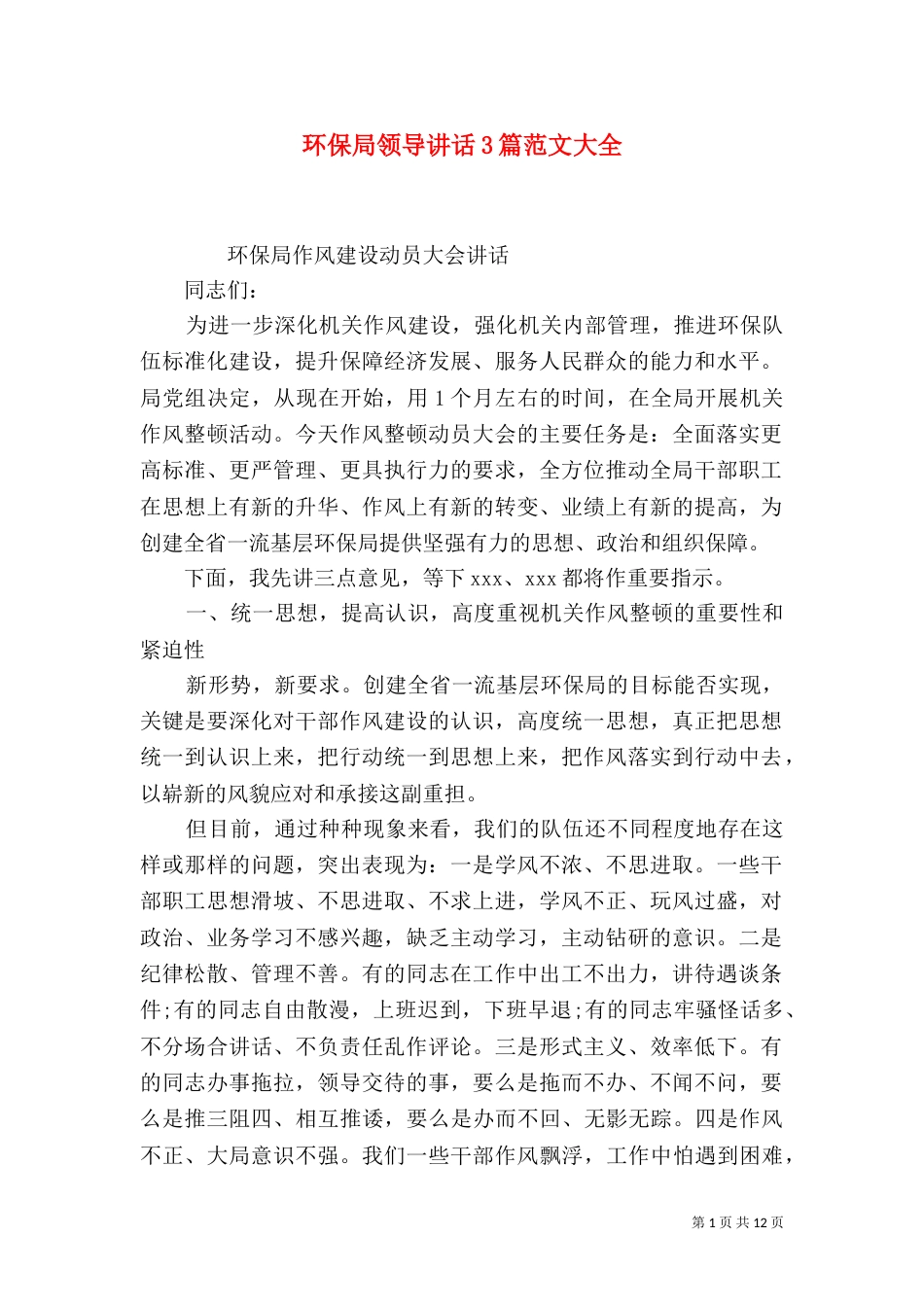 第1页共12页环保局领导讲话3篇范文大全环保局作风建设动员大会讲话同志们:为进一步深化机关作风建设,强化机关内部管理,推进环保队伍标准...