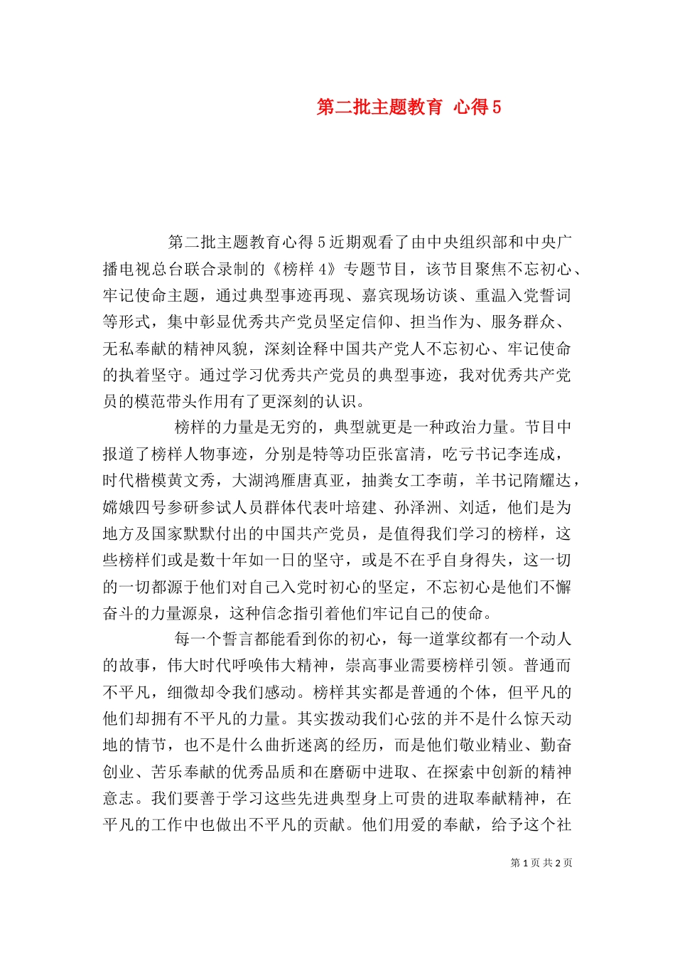 第1页共2页第二批主题教育心得5第二批主题教育心得5近期观看了由中央组织部和中央广播电视总台联合录制的《榜样4》专题节目,该节目聚焦不...