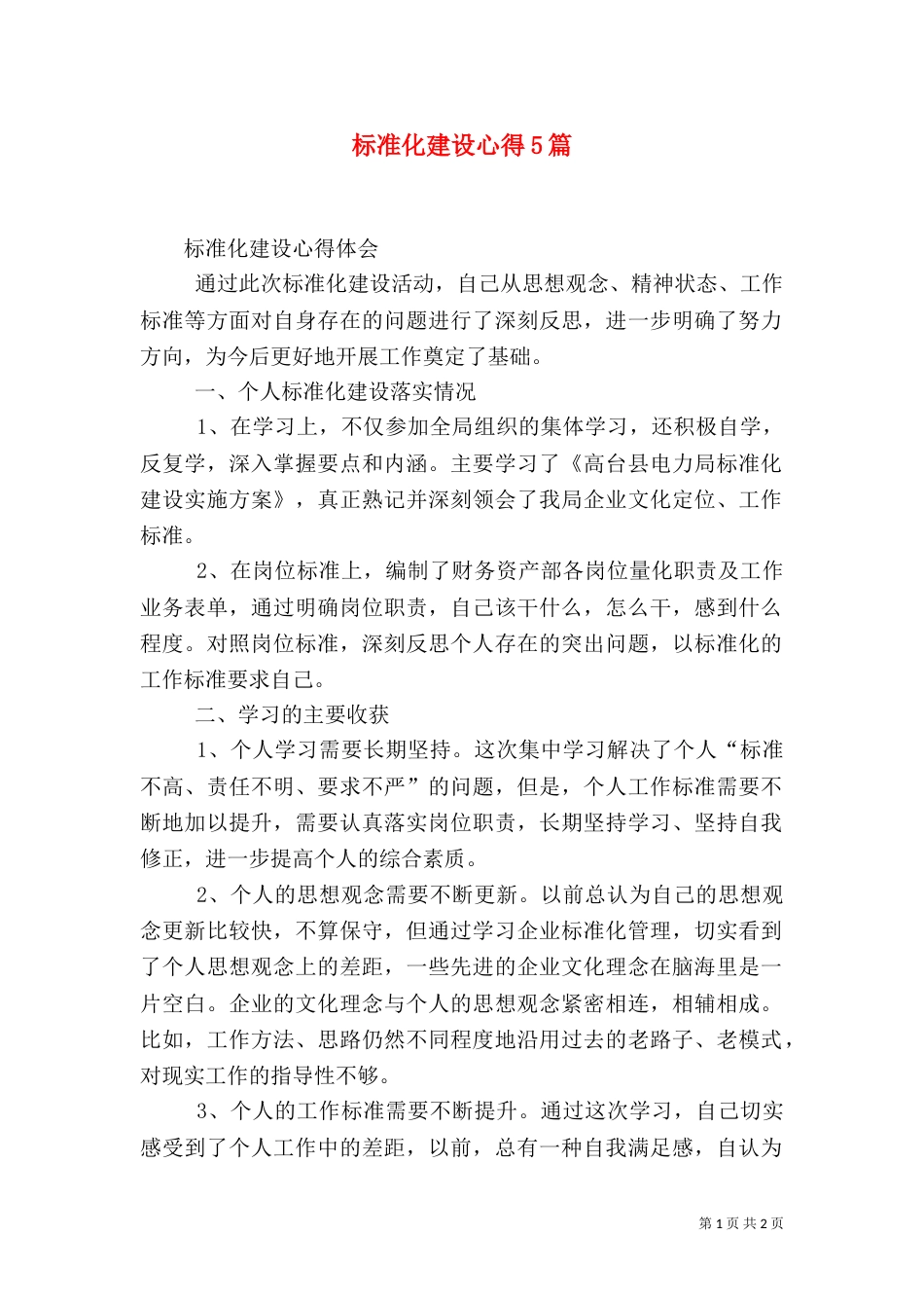 第1页共2页书山有路勤为径,学海无涯苦作舟。标准化建设心得5篇标准化建设心得体会通过此次标准化建设活动,自己从思想观念、精神状态、工...