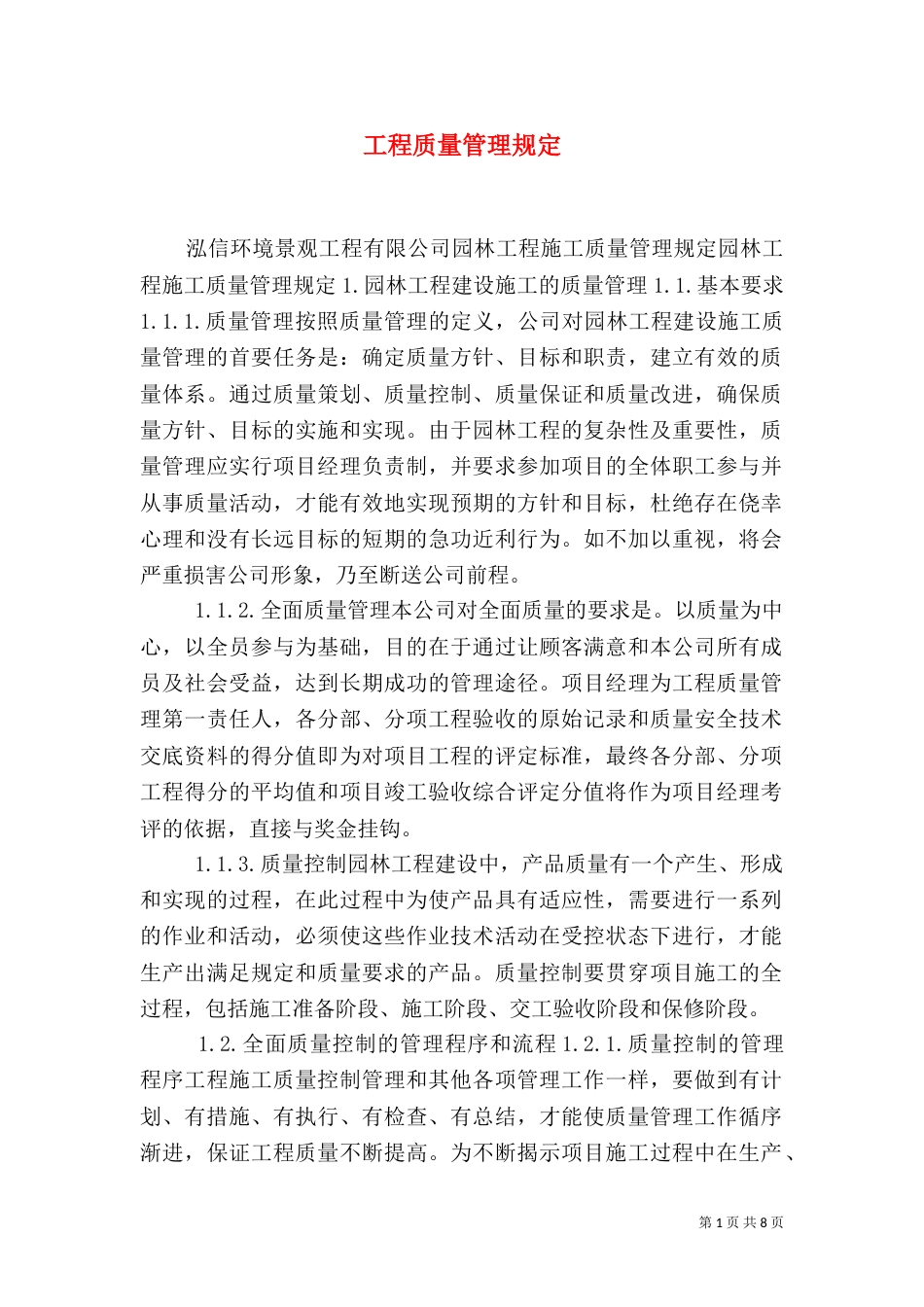 第1页共8页书山有路勤为径,学海无涯苦作舟。工程质量管理规定泓信环境景观工程有限公司园林工程施工质量管理规定园林工程施工质量管理规定...