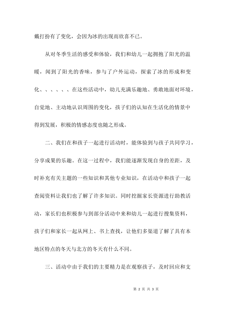 第1页共3页小班活动《冬天来了》主题反思小班活动《冬天来了》主题反思冬天是令人难忘的,更是值得去体验的。我们通过带领孩子们观察、体验...