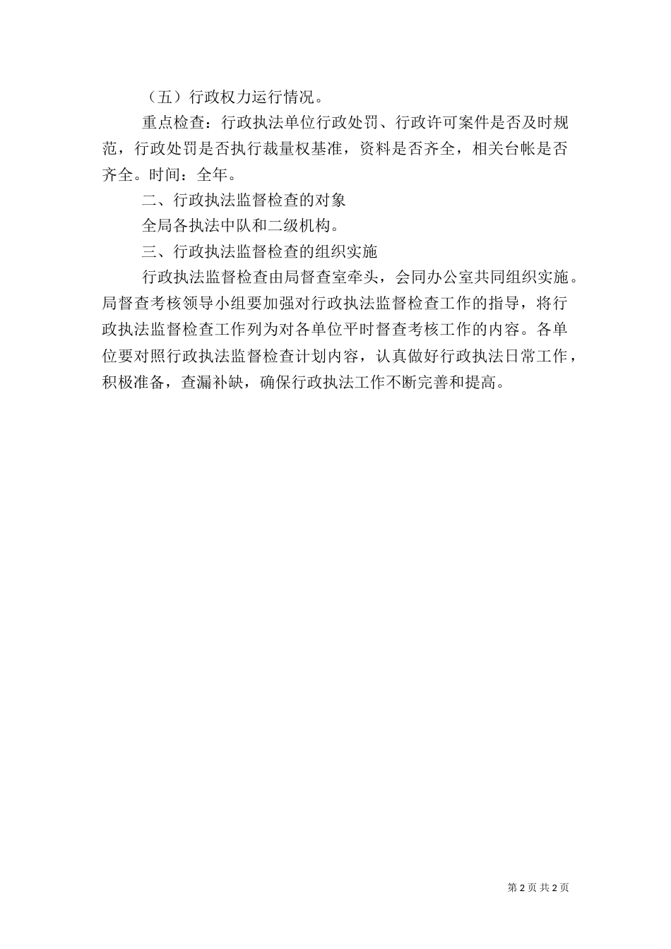 第1页共2页书山有路勤为径,学海无涯苦作舟。行政执法监督检查计划行政执法监督检查计划为了加强对行政执法工作的监督,促进系统内行政执法...