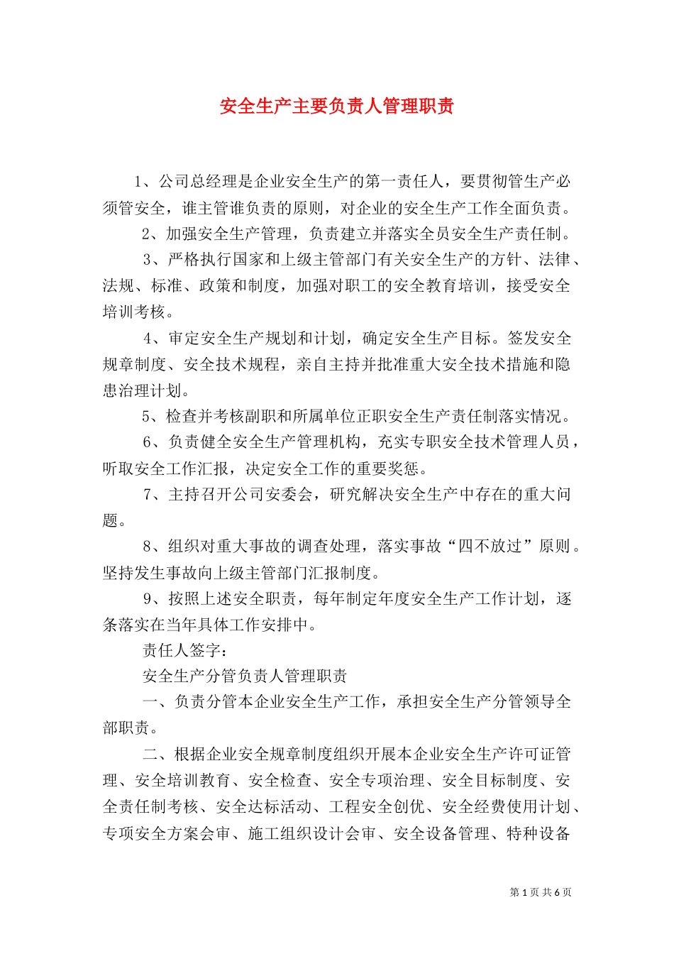第1页共6页书山有路勤为径,学海无涯苦作舟。安全生产主要负责人管理职责1、公司总经理是企业安全生产的第一责任人,要贯彻管生产必须管安...