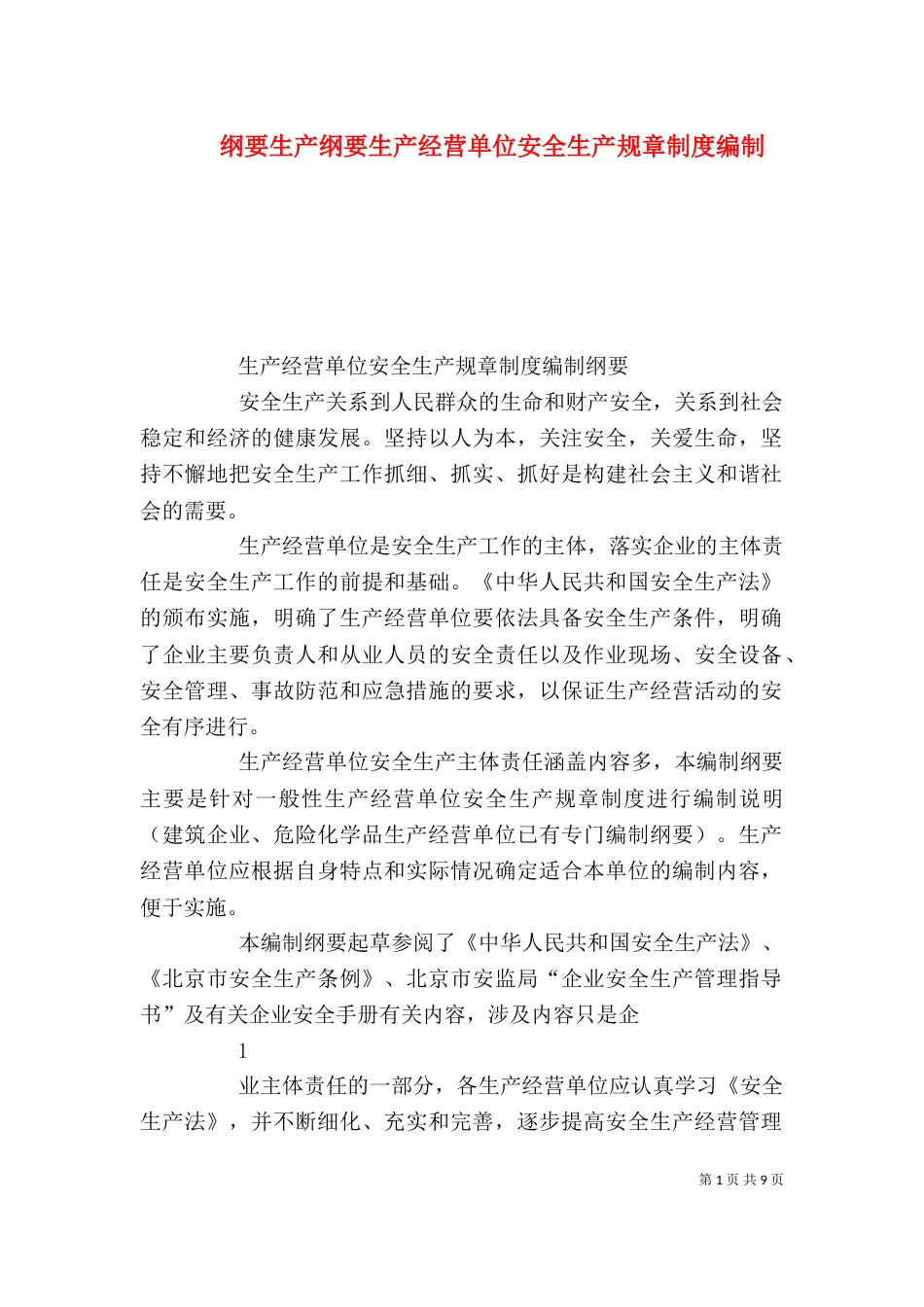 第1页共9页纲要生产纲要生产经营单位安全生产规章制度编制生产经营单位安全生产规章制度编制纲要安全生产关系到人民群众的生命和财产安全,...