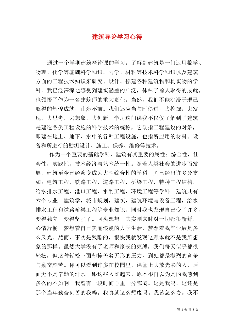 第1页共5页书山有路勤为径,学海无涯苦作舟。建筑导论学习心得通过一个学期建筑概论课的学习,了解到建筑是一门运用数学、物理、化学等基础...
