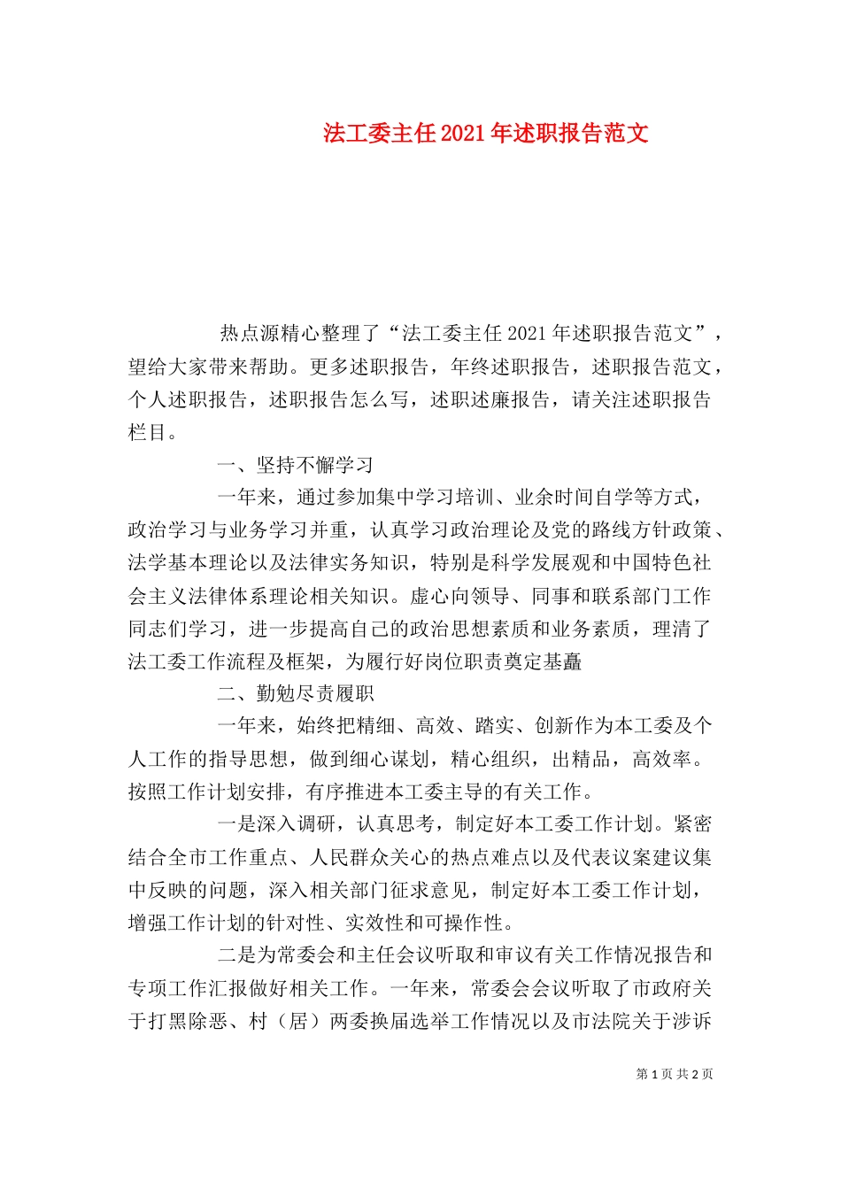 第1页共2页法工委主任2021年述职报告范文热点源精心整理了“法工委主任2021年述职报告范文”,望给大家带来帮助。更多述职报告,年终述职报...