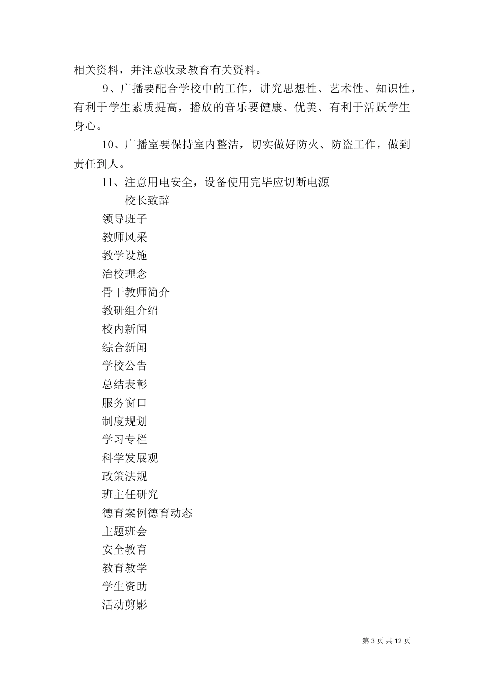 第1页共12页书山有路勤为径,学海无涯苦作舟。广播室管理制度一、广播室是学校的宣传阵地。广播员要有热爱祖国、热爱学校、热爱集体的精神...