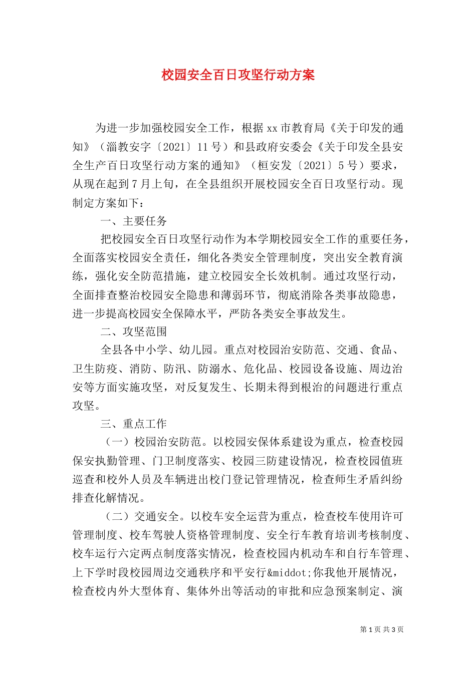 第1页共3页书山有路勤为径,学海无涯苦作舟。校园安全百日攻坚行动方案为进一步加强校园安全工作,根据xx市教育局《关于印发的通知》(淄教...