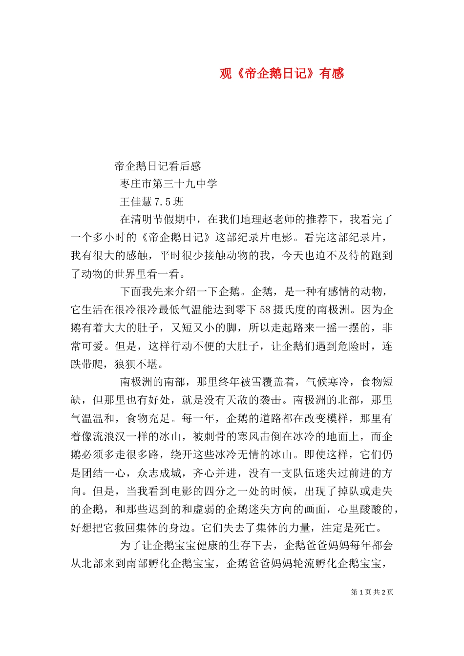 第1页共2页观《帝企鹅日记》有感帝企鹅日记看后感枣庄市第三十九中学王佳慧7.5班在清明节假期中,在我们地理赵老师的推荐下,我看完了一个...