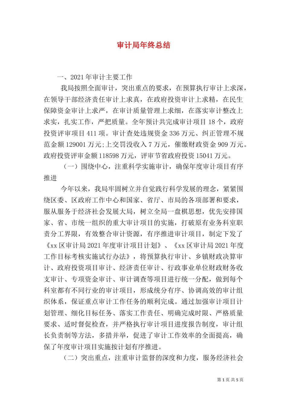第1页共5页书山有路勤为径,学海无涯苦作舟。审计局年终总结一、2021年审计主要工作我局按照全面审计,突出重点的要求,在预算执行审计上求...