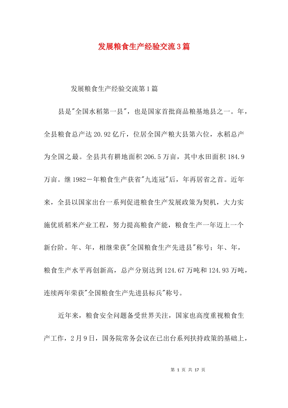 第1页共17页发展粮食生产经验交流3篇发展粮食生产经验交流第1篇县是"全国水稻第一县",也是国家首批商品粮基地县之一。年,全县粮食总产达2...