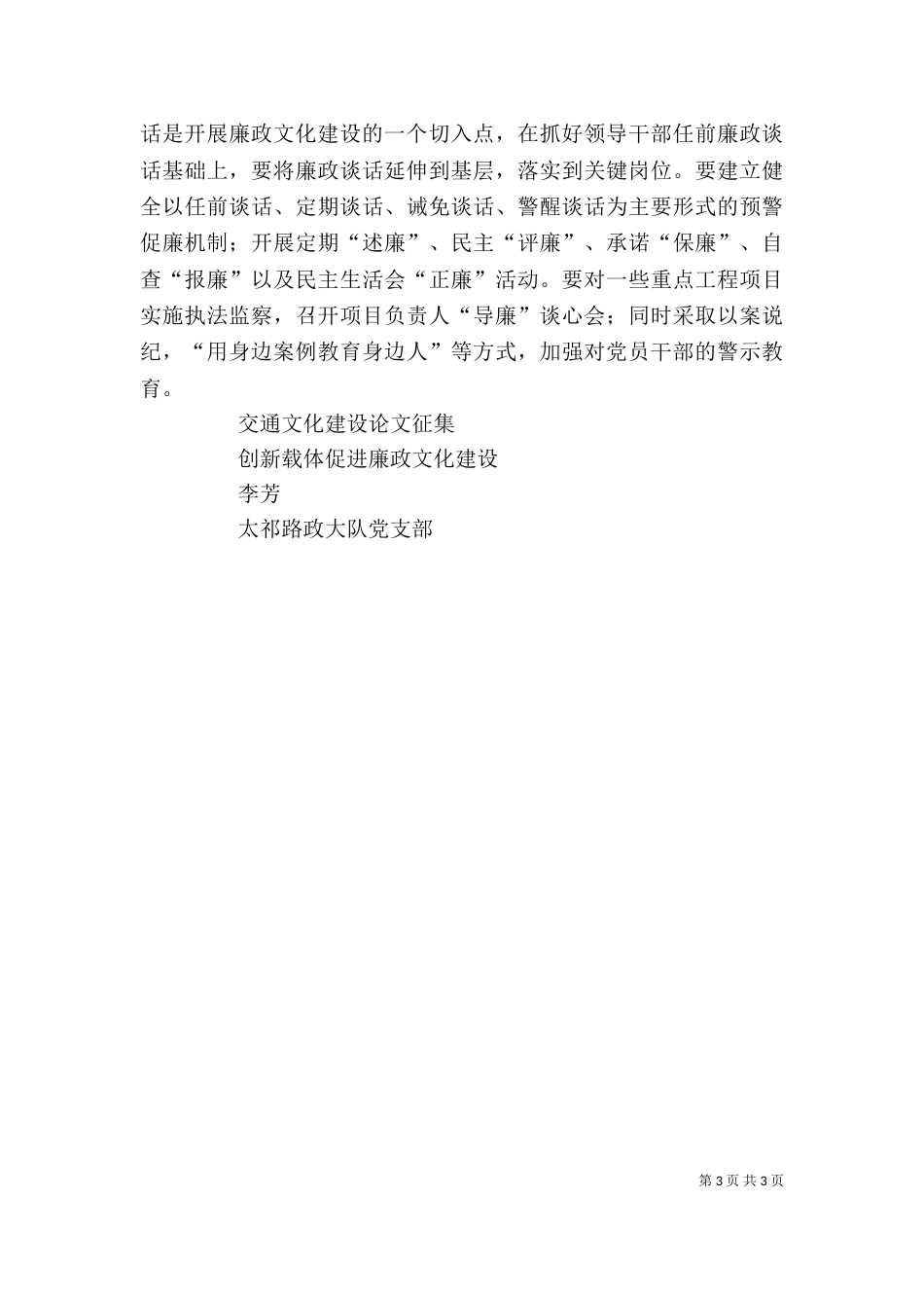 第1页共3页加强创新文化建设,促进创新能力提升(讲话稿)创新载体促进廉政文化建设李芳太祁路政大队党支部廉政文化建设是建设社会主义先进文...