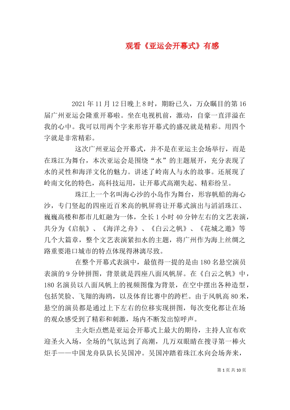 第1页共10页观看《亚运会开幕式》有感2021年11月12日晚上8时,期盼已久,万众瞩目的第16届广州亚运会隆重开幕啦。坐在电视机前,激动,自豪...