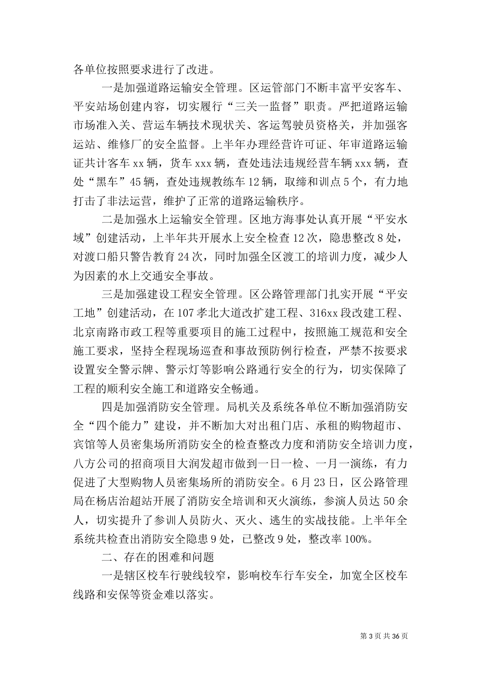第1页共36页书山有路勤为径,学海无涯苦作舟。消防安全上半年工作总结12篇【一】上半年,在区委、区政府和市交通运输局的正确领导及相关部...
