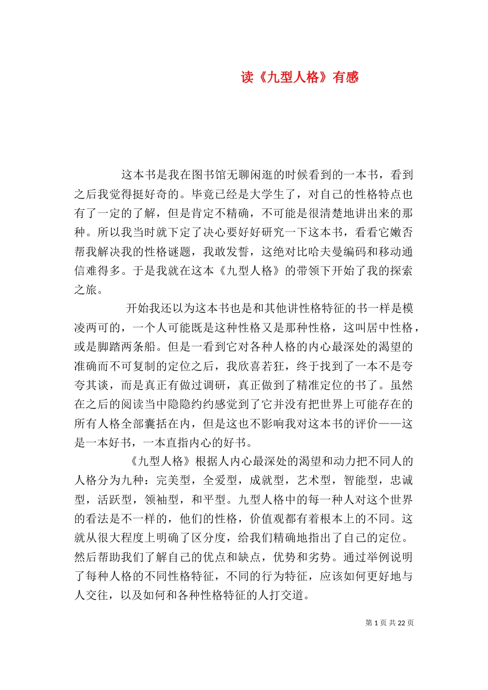 第1页共22页读《九型人格》有感这本书是我在图书馆无聊闲逛的时候看到的一本书,看到之后我觉得挺好奇的。毕竟已经是大学生了,对自己的性...