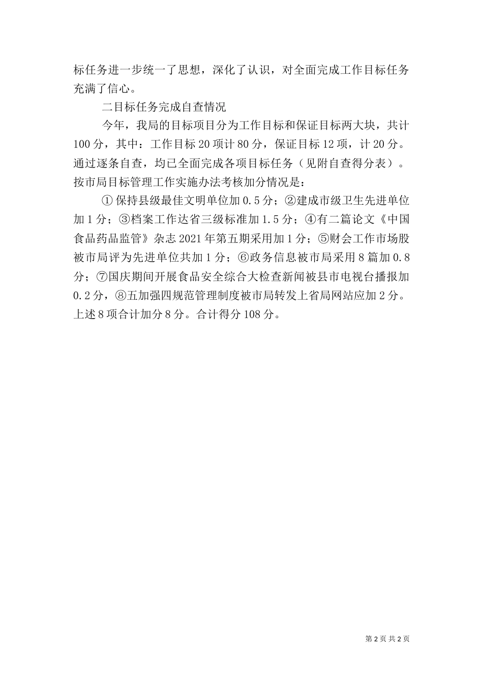 第1页共2页书山有路勤为径,学海无涯苦作舟。食品药品监督管理局工作目标完成情况自查汇报2021年,我们在食品药品监督管理局和县委县人民政...