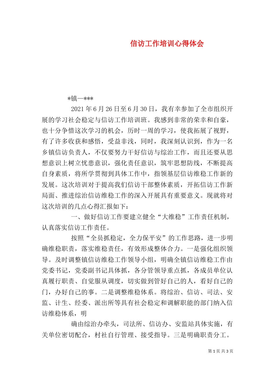 第1页共3页信访工作培训心得体会*镇—***2021年6月26日至6月30日,我有幸参加了全市组织开展的学习社会稳定与信访工作培训班。我感到非常的...