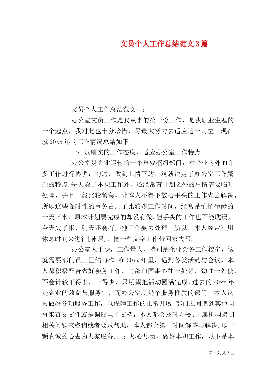 第1页共7页文员个人工作总结范文3篇文员个人工作总结范文一:办公室文员工作是我从事的第一份工作,是我职业生涯的一个起点,我对此也十分...