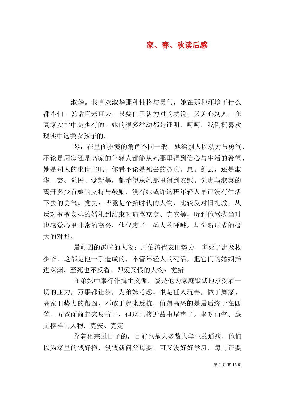 第1页共13页家、春、秋读后感淑华。我喜欢淑华那种性格与勇气,她在那种环境下什么都不怕,说话直来直去,只要自己认为对的就说,又关心别...