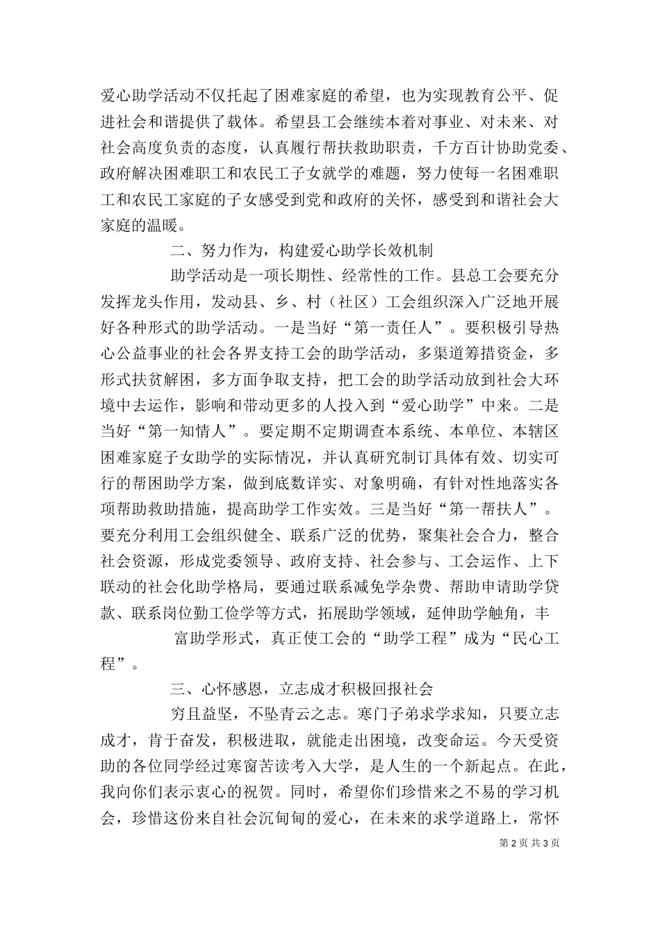 第1页共3页在助农仪式上的讲话在“金秋助学”仪式上的讲话同学们、同志们:在2021年新学期即将开学之际,今天,县总工会在这里举行2021年“...