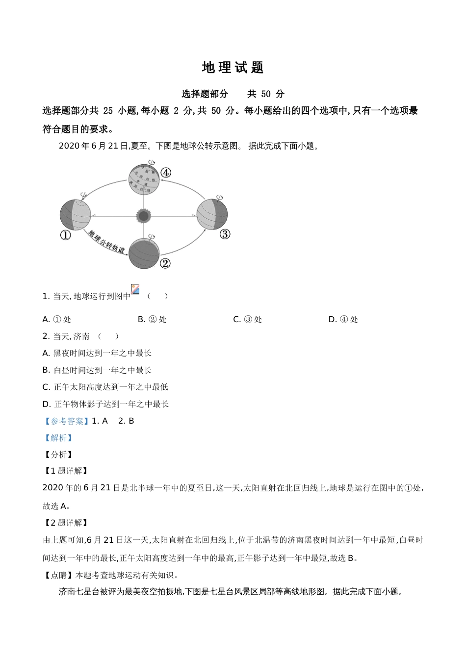 地理试题选择题部分共50分选择题部分共25小题,每小题2分,共50分。每小题给出的四个选项中,只有一个选项最符合题目的要求。2020年6月21日,夏...