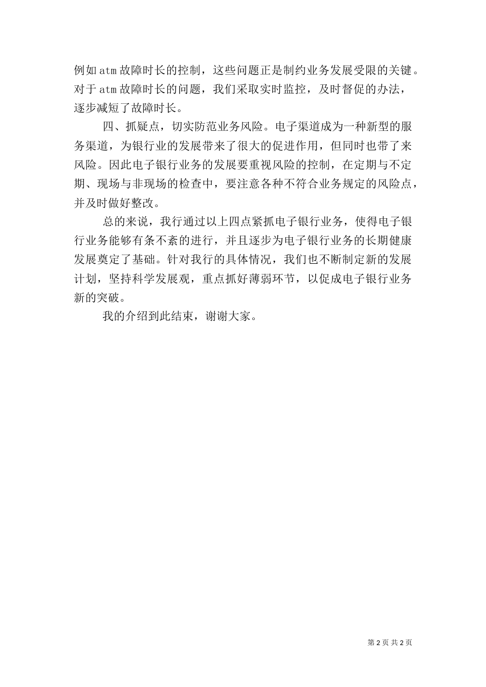 第1页共2页书山有路勤为径,学海无涯苦作舟。电子银行经验介绍电子银行业务经验介绍尊敬的各位领导、同事们:大家好。今天,我很荣幸在这里...