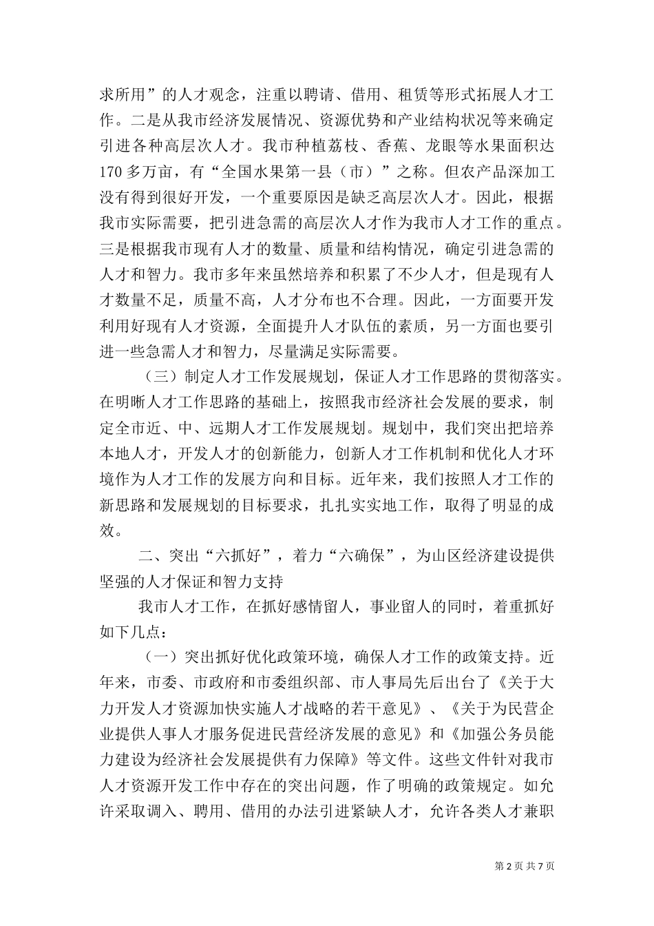第1页共7页书山有路勤为径,学海无涯苦作舟。推进人才工作汇报我市地处****山区,属经济欠发达地区。近年来,在市委、市政府的领导下,在上...