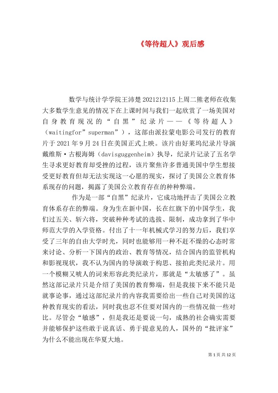 第1页共12页《等待超人》观后感数学与统计学学院王沛楚2021212115上周二熊老师在收集大多数学生意见的情况下在上课时间与我们一起欣赏了一...