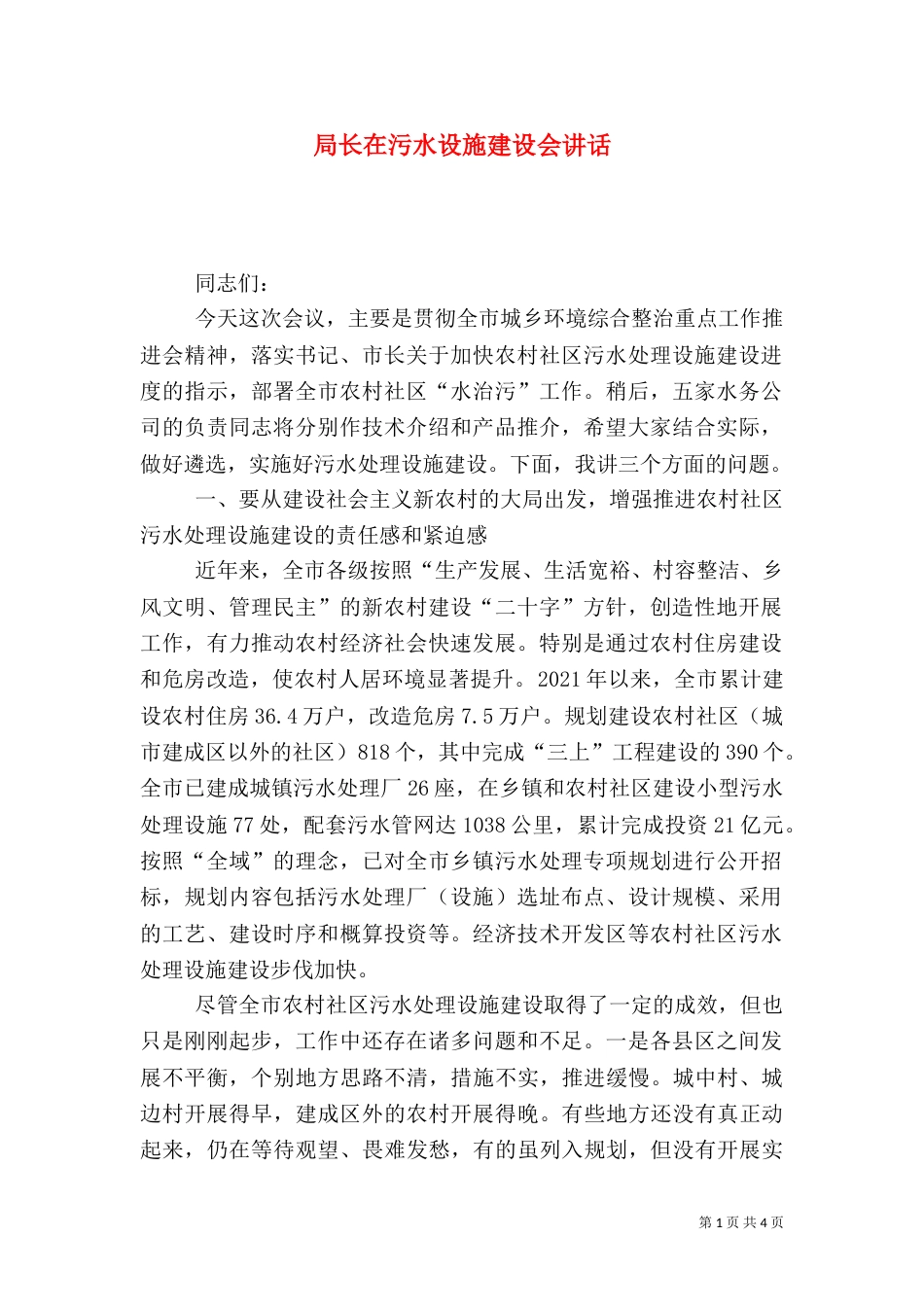 第1页共4页书山有路勤为径,学海无涯苦作舟。局长在污水设施建设会讲话同志们:今天这次会议,主要是贯彻全市城乡环境综合整治重点工作推进...