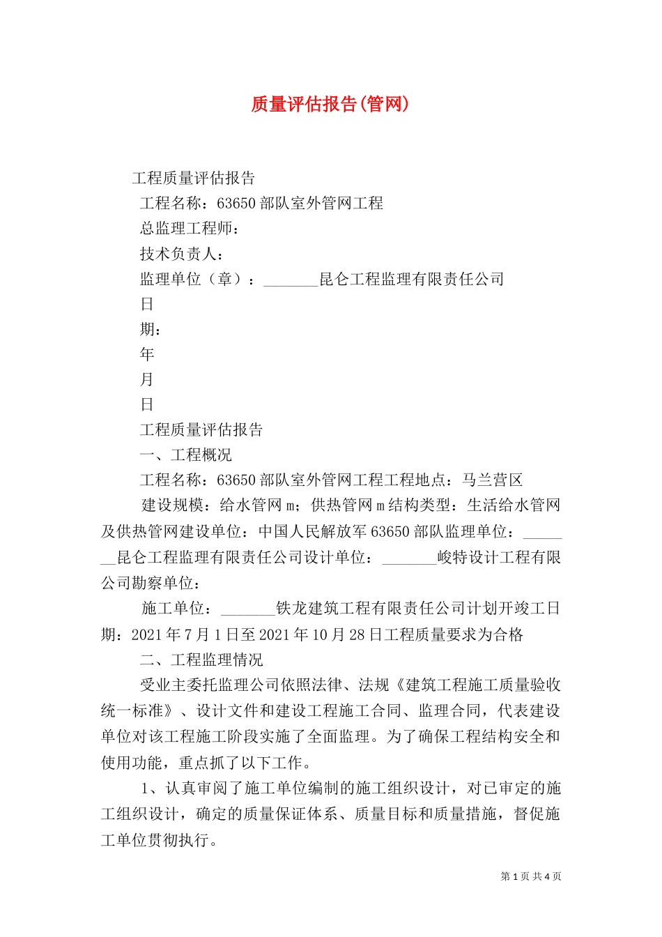 第1页共4页书山有路勤为径,学海无涯苦作舟。质量评估报告(管网)工程质量评估报告工程名称:63650部队室外管网工程总监理工程师:技术负责...