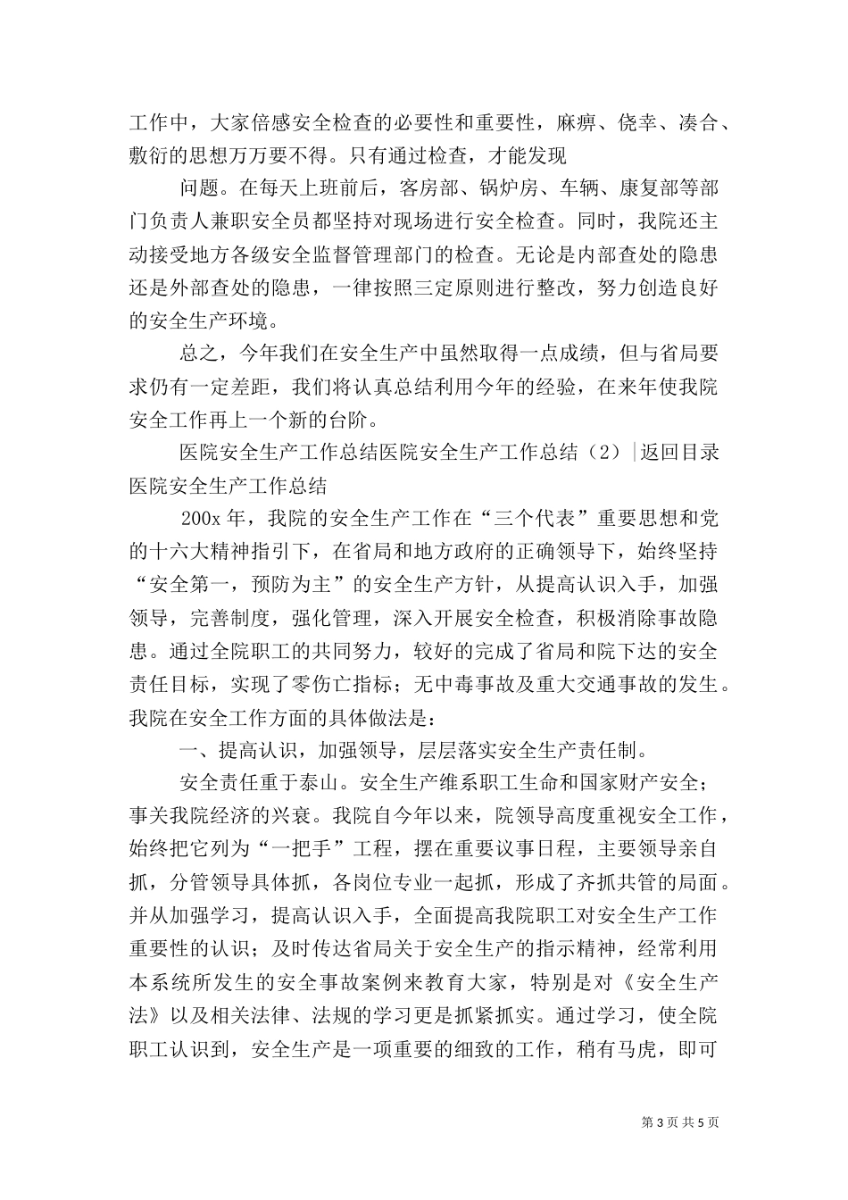 第1页共5页书山有路勤为径,学海无涯苦作舟。医院安全生产工作总结2篇20xx年,我院的安全生产工作在三个代表重要思想和党的xx大精神指引下...